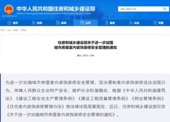 通知主要內(nèi)容如下:一、按照誰所有誰負責、誰使用誰負責的原則,城市房屋所有人、使用人(以下統(tǒng)稱裝修人)是房屋室內(nèi)裝飾裝修安全管理的第一責任人,實施房屋室內(nèi)裝飾裝修活動應當嚴格遵守有關(guān)法律法規(guī)規(guī)...